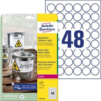 Etikett, kör, 30 mm, poliészter, időjárásálló, AVERY ZWECKFORM, fehér, 960 etikett/csomag