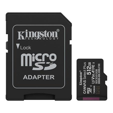 Memóriakártya, microSDXC, 512GB, C10/UHS-I/U1-U3/V10-V30/A1, Gen3, adapter, KINGSTON "Canvas Select Plus"